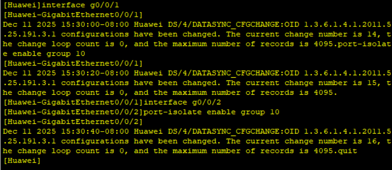 port-isolate enable group 10 # 将该接口接入隔离组1,同一隔离组的接口在L2模式下之间不能通信。