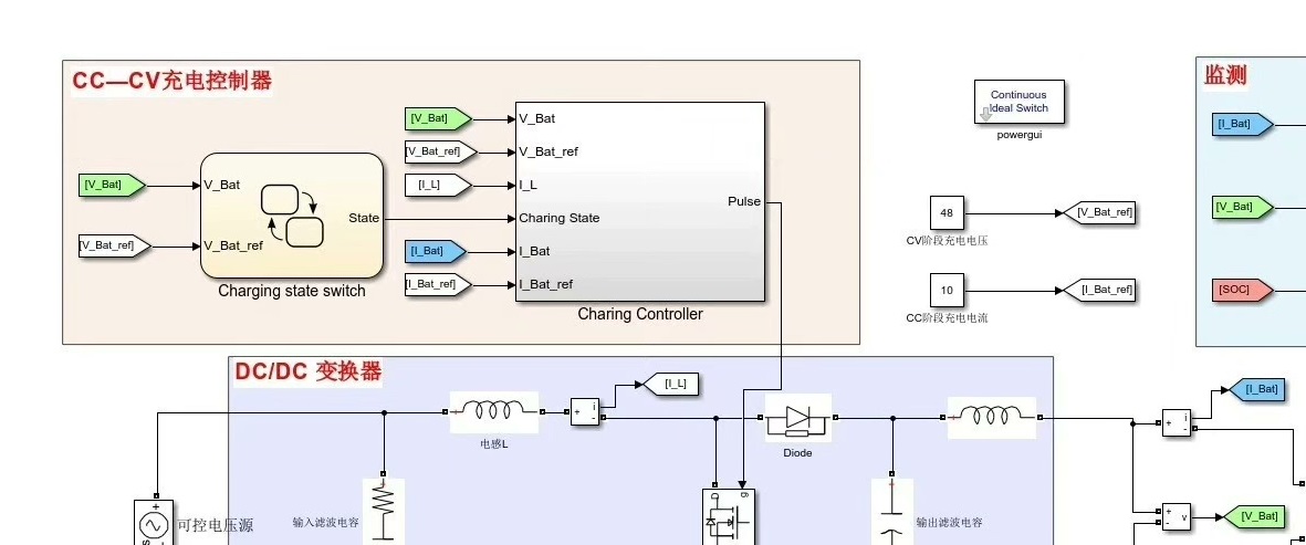 我们在Simulink中搭建的模型大致可分为电源模块、充电控制模块、电池模型模块以及测量与显示模块。