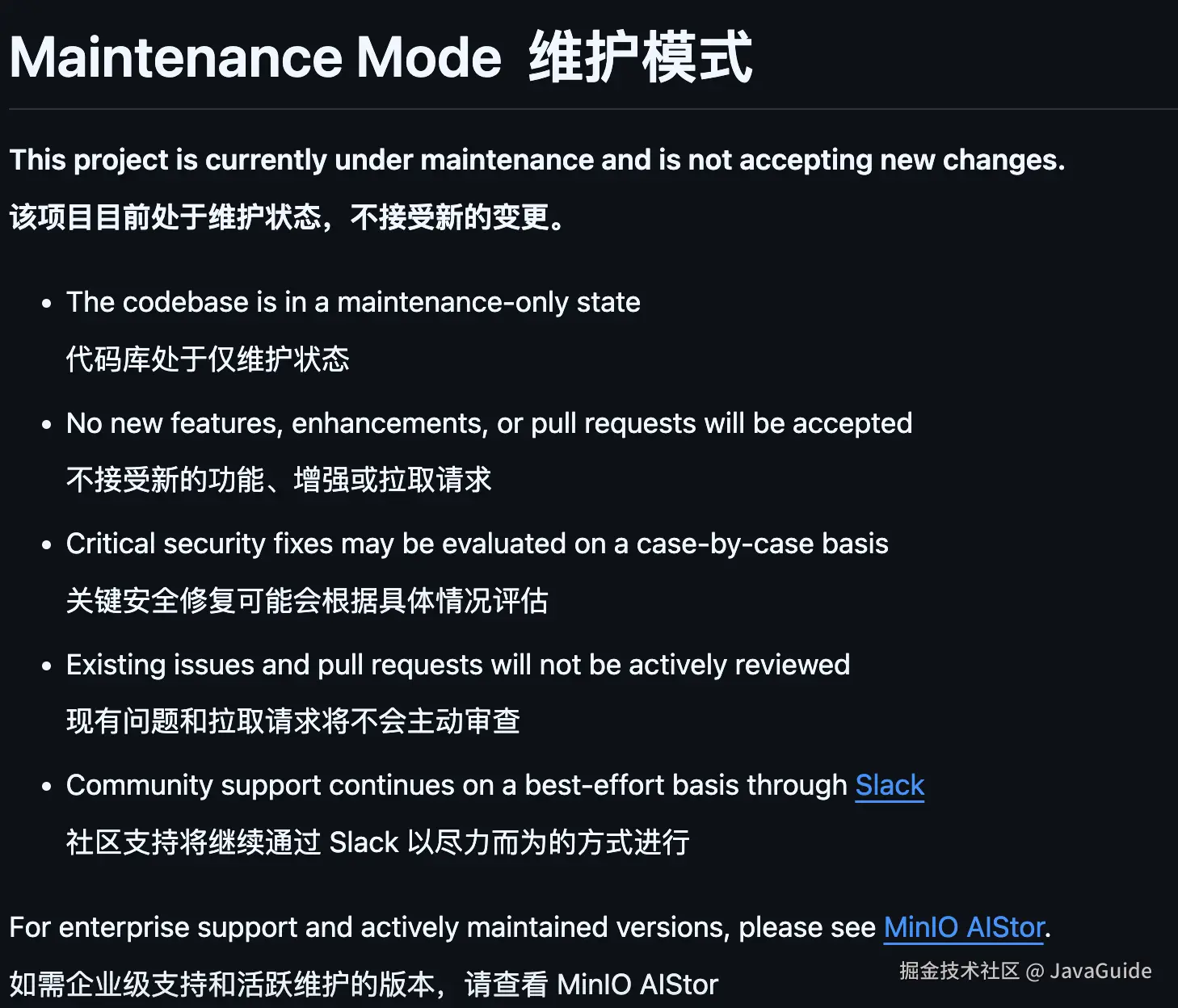 最近 MinIO 官方在 README 中正式宣布项目进入"维护模式":