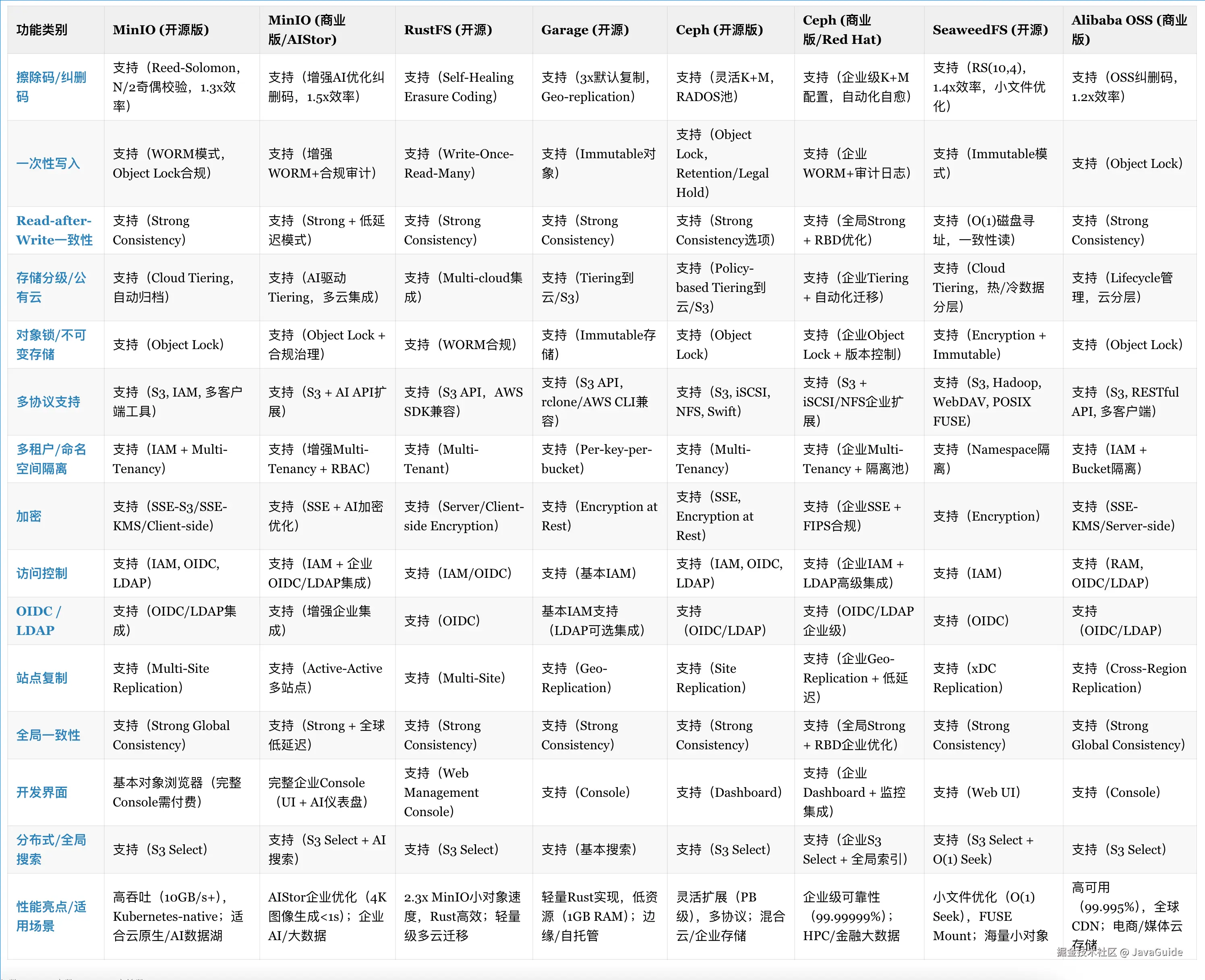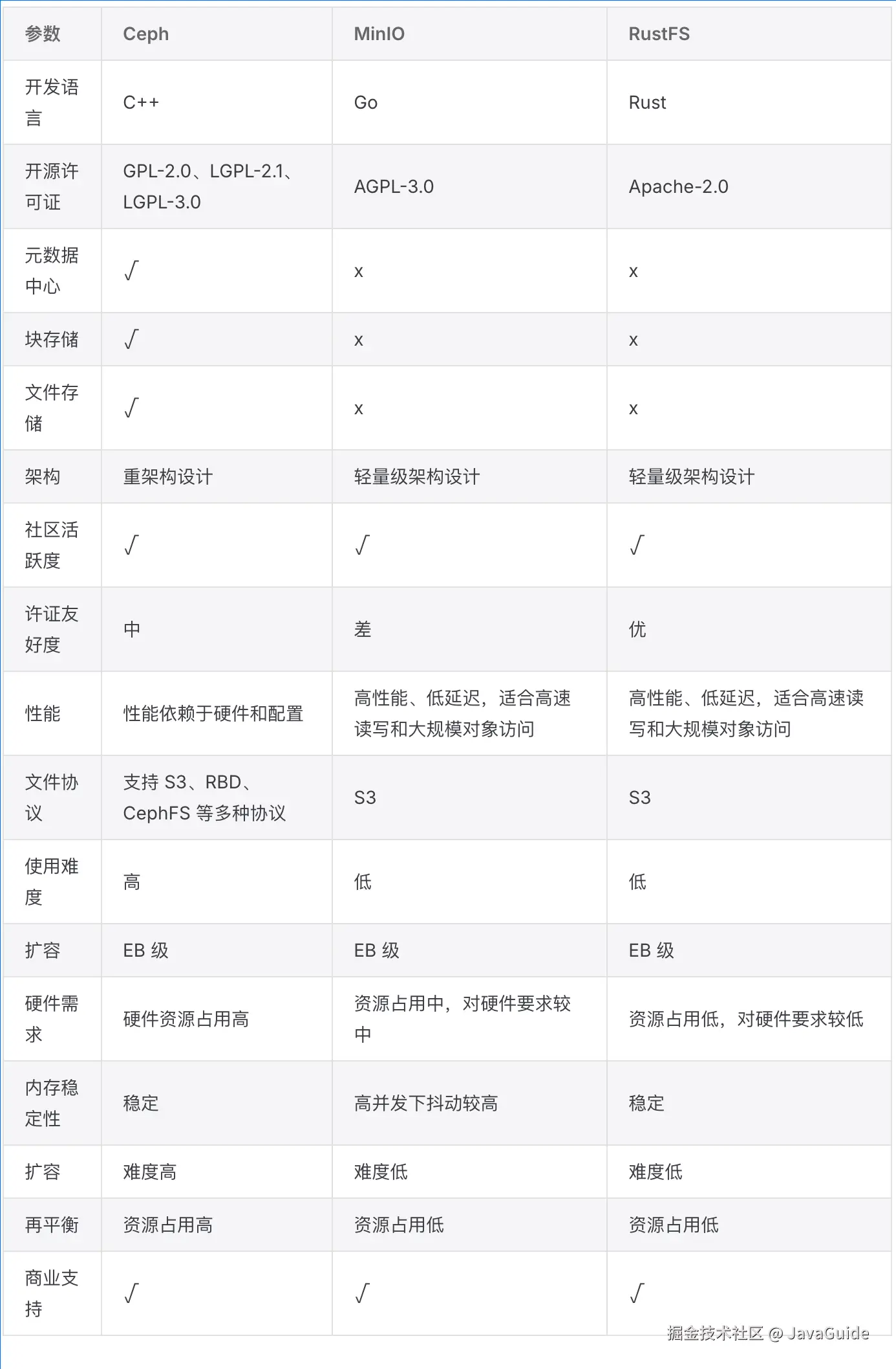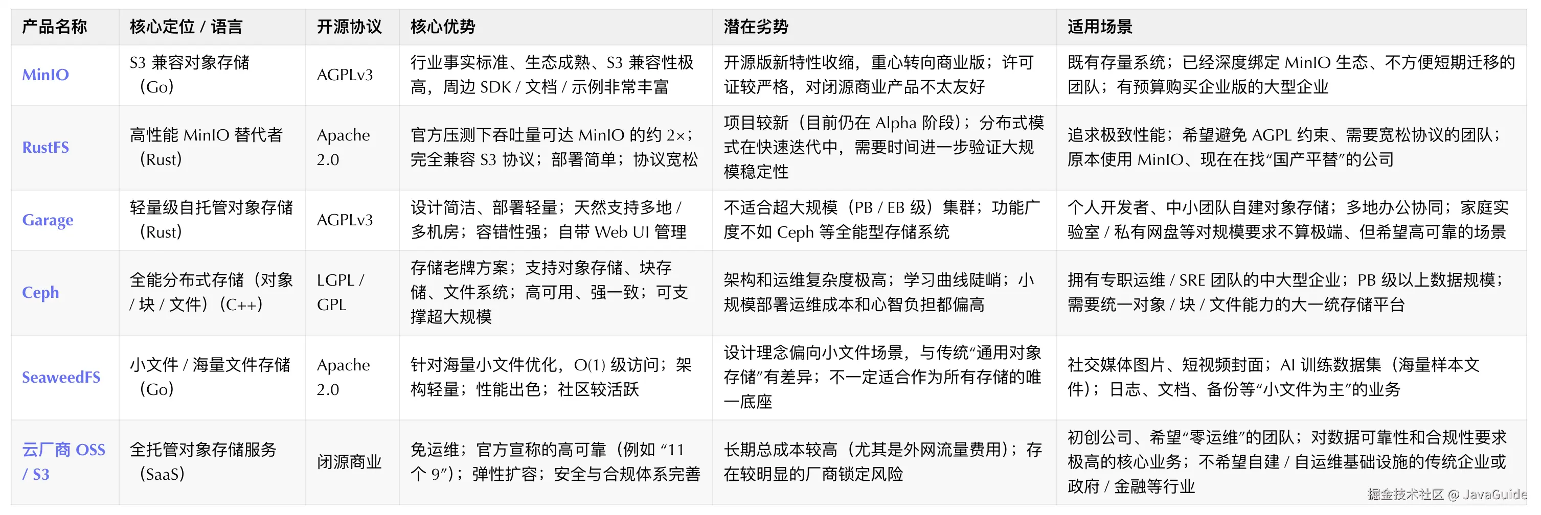 - 如果只是存一些图片、视频等普通业务文件,而且对"可用性省心、少运维"更看重, 那么直接用云厂商的 OSS / COS / S3 往往是成本和精力投入都更优的选择(JavaGuide(javaguide.cn)上所有的图片都存放在 OSS 中)。