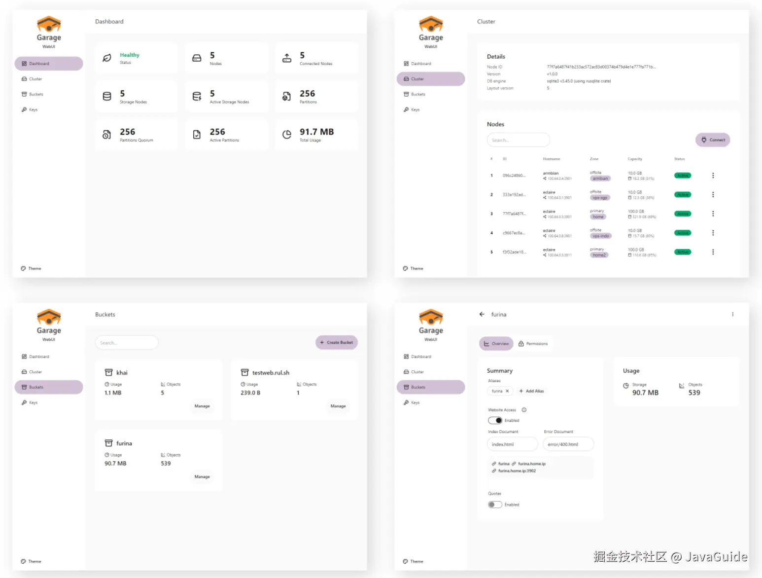 为了让管理更简单,Garage 同样提供了一个独立的 Web 管理界面 ------ Garage Web UI。它是 Garage 对象存储的前端控制台,帮助你通过浏览器完成日常运维工作,主要功能包括:健康状态监控、桶(Bucket)管理、对象浏览、访问密钥管理等。