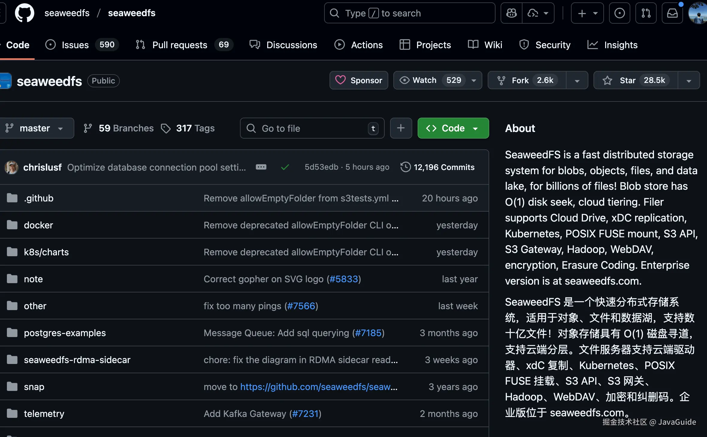 SeaweedFS 是专为"几十亿小文件 + 高并发读写"场景设计的高性能分布式存储系统。其核心设计灵感源自 Facebook 的 Haystack 论文,通过将元数据分散到卷服务器(Volume Server),实现了单次磁盘访问 O(1) 的极致读取效率。它社区活跃度高,文档完善,且架构轻量,运维成本远低于 Ceph。