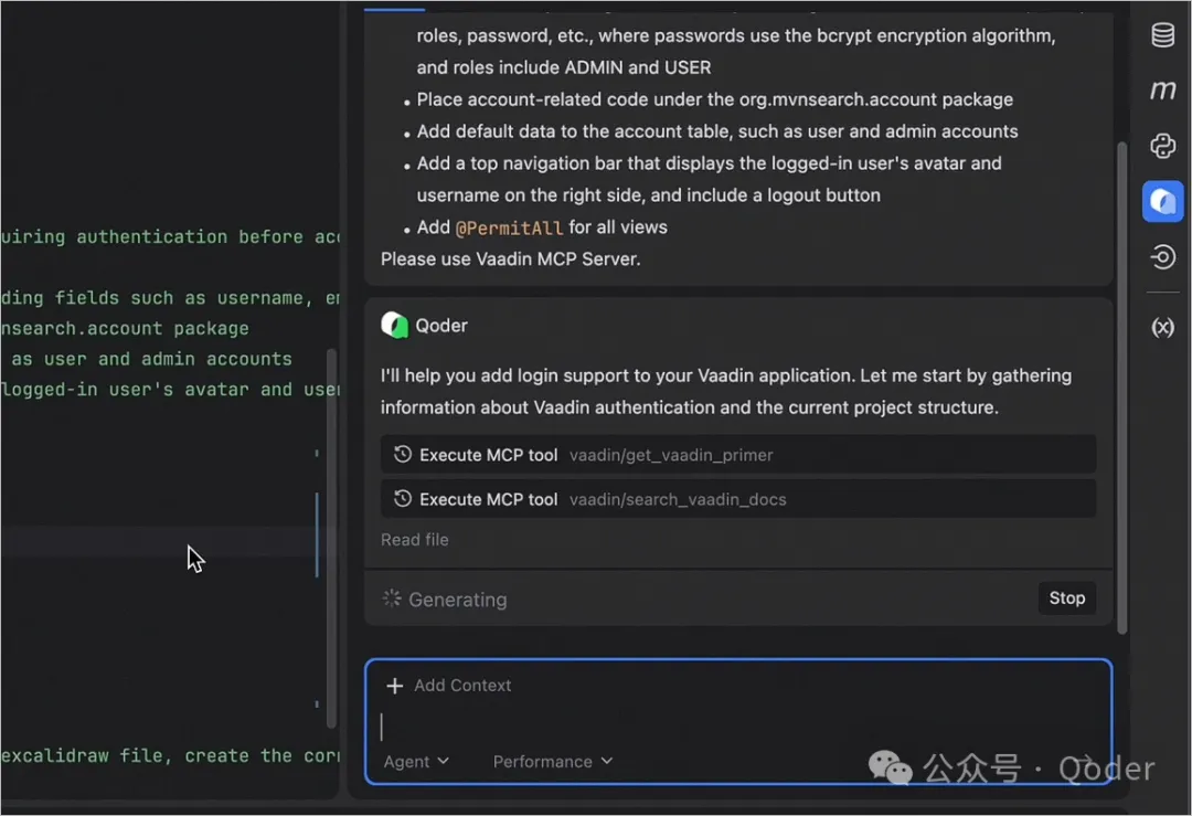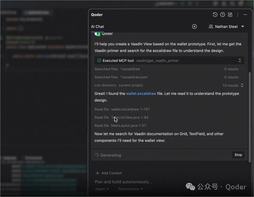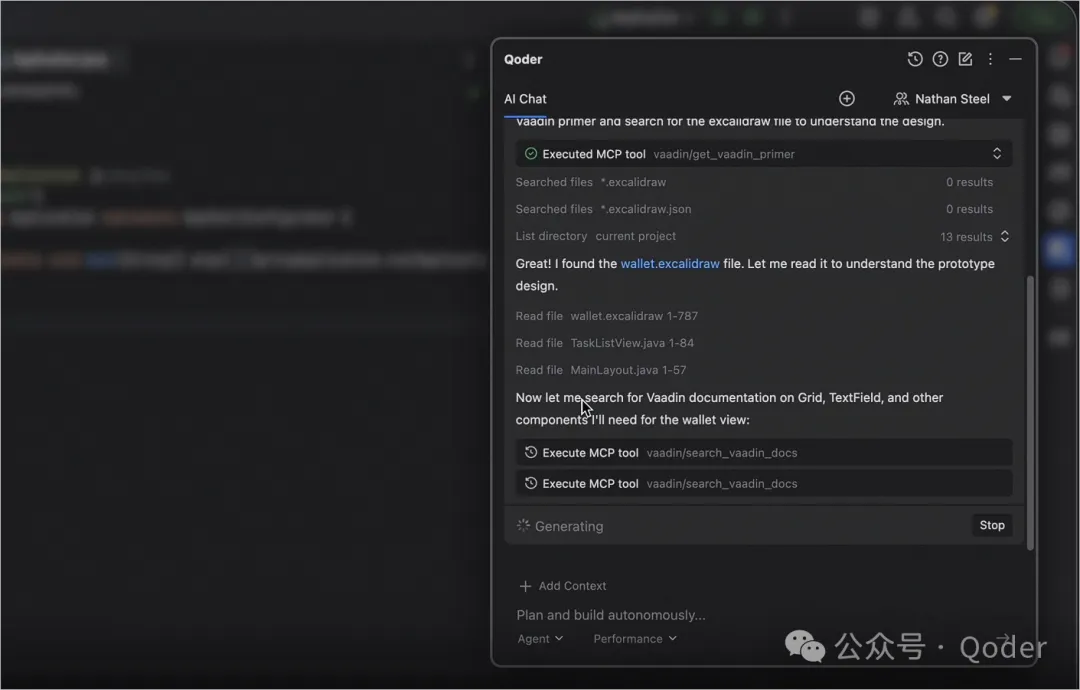 此时,Qoder 可以实时查询官方 Vaadin 组件文档。后续的界面生成会依赖这一能力。