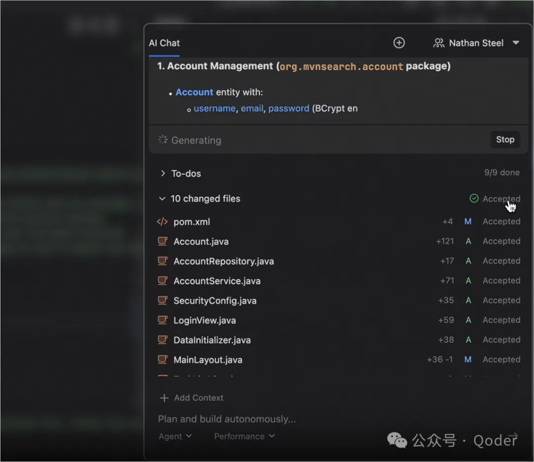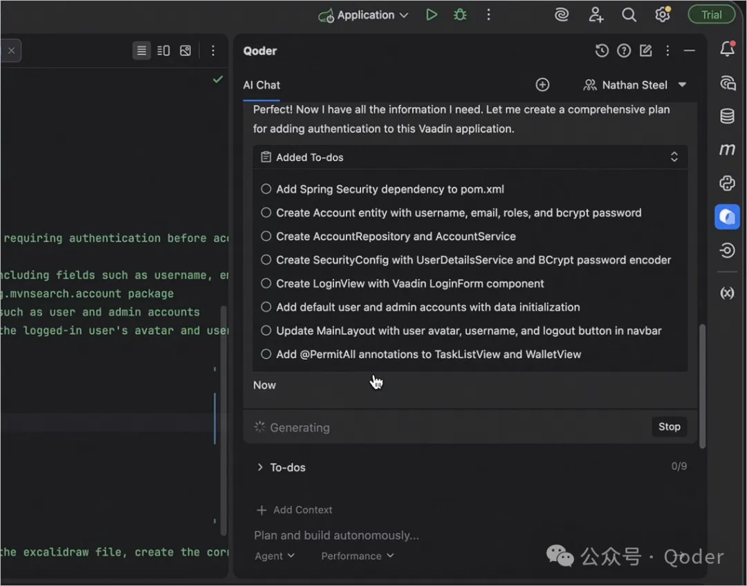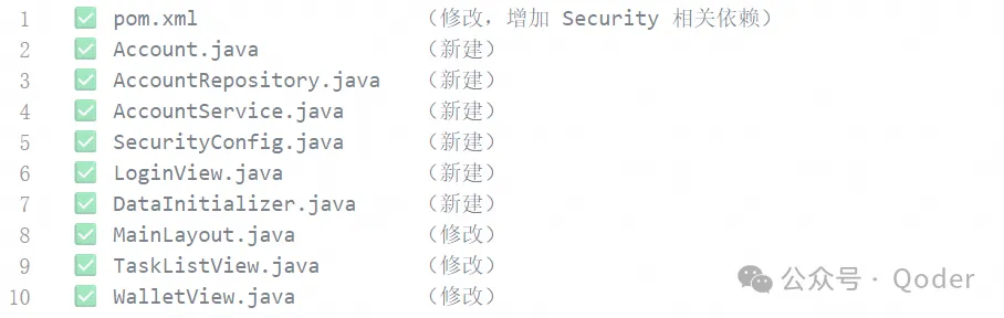 在理解需求和环境后,Qoder 不会马上生成全部代码。它会先生成一个包含 9 个子任务的 To-do 列表。 列表大致覆盖依赖调整、实体设计、安全配置、界面和数据初始化等环节。