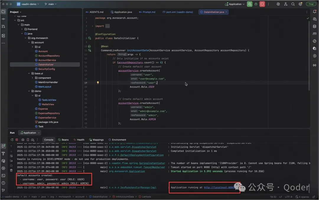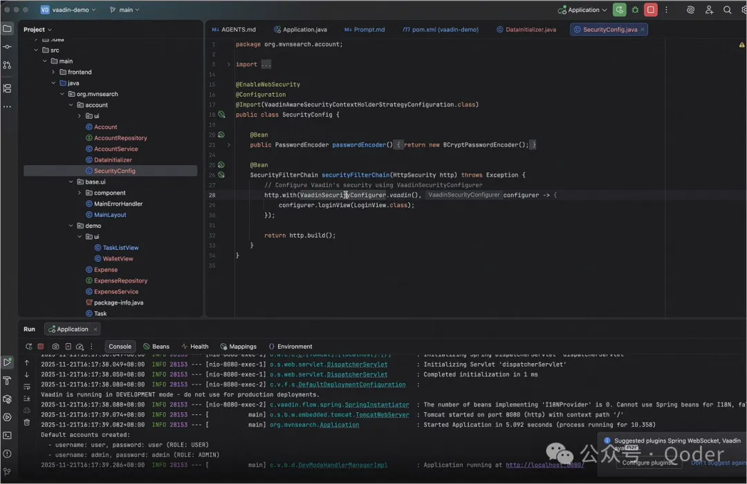 LLM 内置知识存在时间点限制。Vaadin MCP Server 直接接入 Vaadin 官方文档。Qoder 可以按需查询最新的组件 API、布局建议和结合 Spring 的实践方案。在本示例中,Qoder 多次通过 MCP 查询组件和安全相关内容。 这可以减少版本差异带来的踩坑风险。