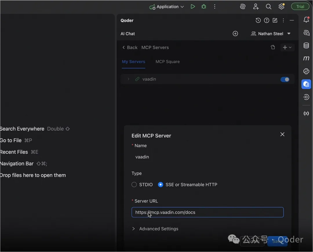 步骤二:在 Qoder 中配置 Vaadin MCP Server