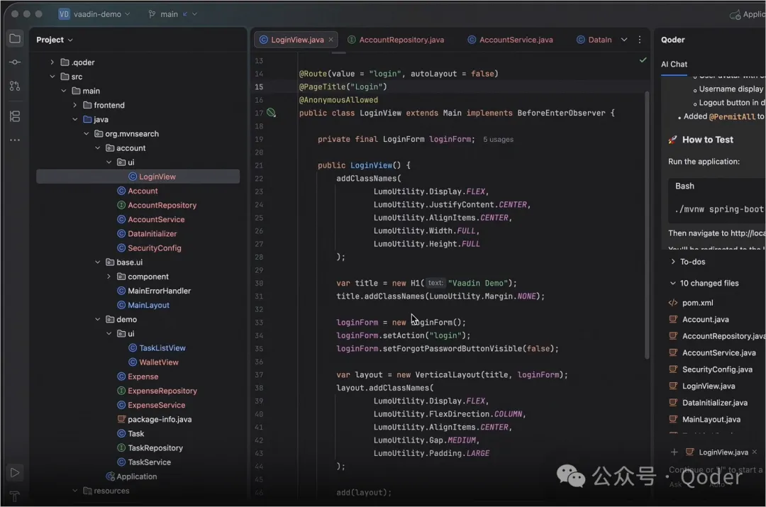在第二个任务中,Qoder 将"登录系统"拆分成 9 个子任务。 从依赖修改开始,逐步落实到实体、配置、界面和初始化数据。这个 To‑do 列表不仅是展示用的说明。 每一步都会驱动后续的读写操作。 用户只需要在关键节点确认方向是否正确,不必手动执行每一个细节步骤。