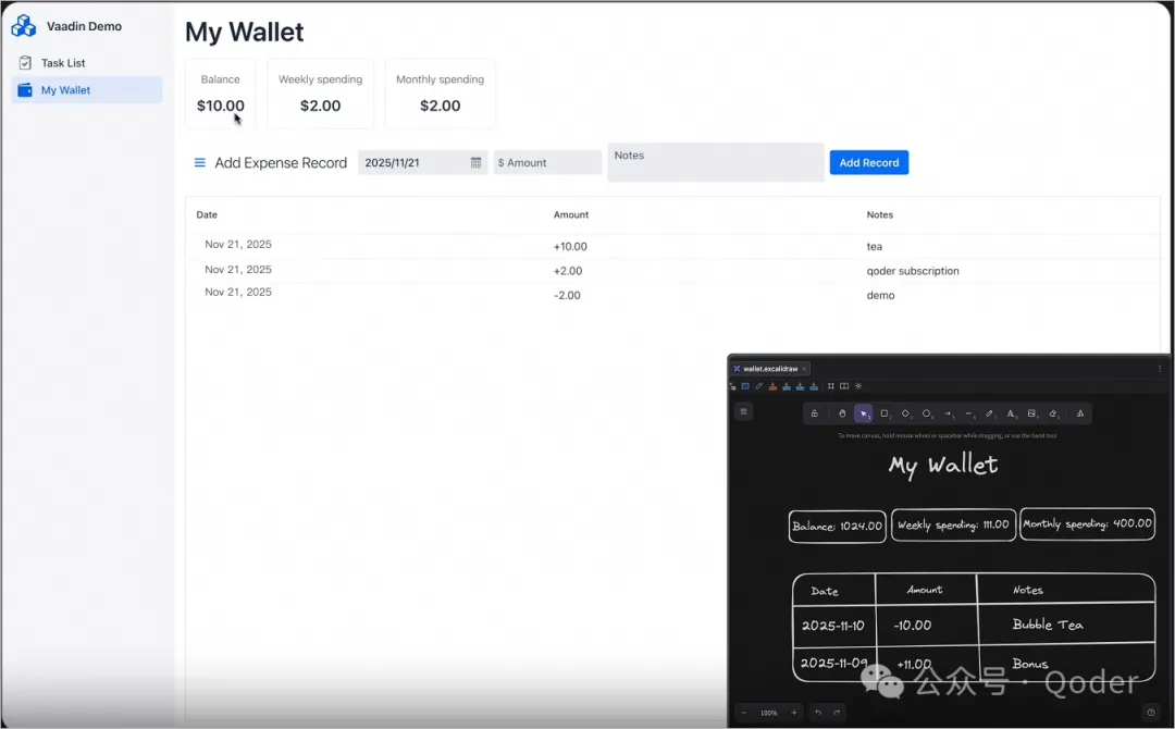 根据excalidraw文件中的钱包原型图并结合 Vaadin Mcp Server,创建对应的 Vaadin View 和相关的 repo, service等,包括消费记录添加操作。结合 Vaadin MCP Server 完成以上任务。