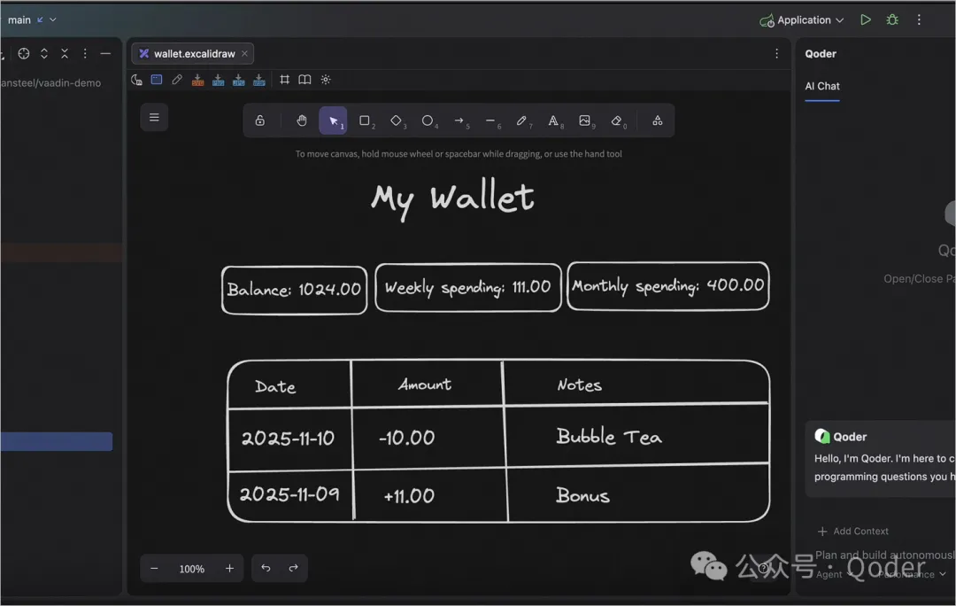 先从一个典型的企业应用功能入手。 你需要一个"钱包管理"页面,用来展示当前余额、输入消费记录、查看消费列表。 如果手写代码,需要创建 Entity、Repository、Service 和 View,还要配置路由和菜单,一般会花掉半小时。用 Qoder JetBrains 插件,可以把这个过程压缩到 2 分钟左右。