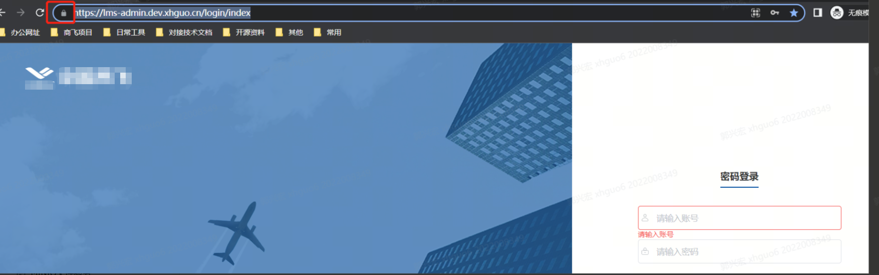 (3)输入域名地址 https://lms-admin.dev.xhguo.cn/login/index,可以看到能够进行https访问,并且有个锁的标志,说明配置成功