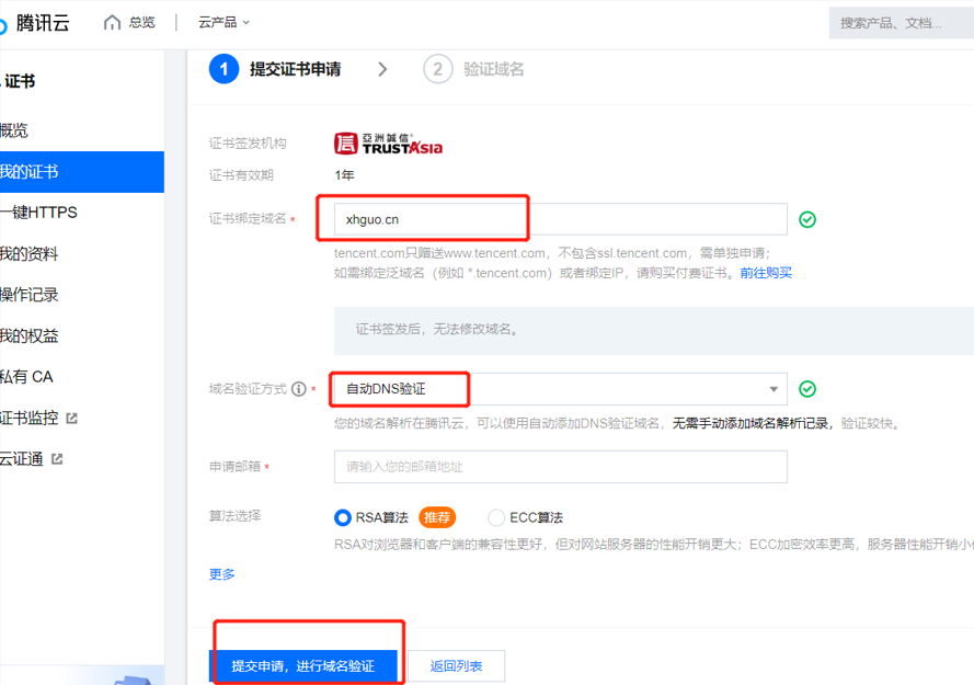 (1)登录腾讯云控制台,选择SSL证书申请,并按照要求,填写正确的域名