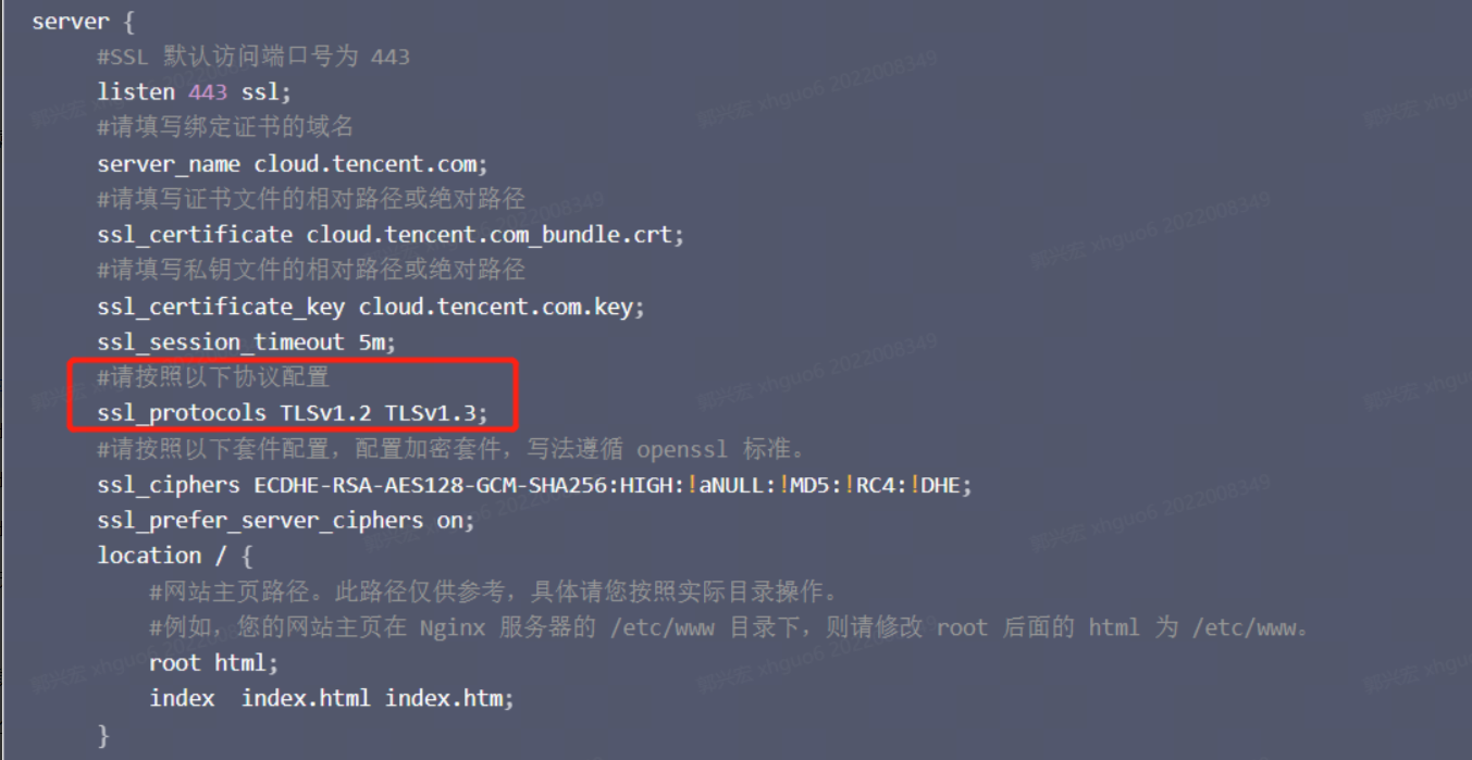 (1)首先查看对应证书的部署说明,以nginx部署证书为例,重点查看支持的SSL协议,如下图所示:说明openssl需要支持TLSv1.2和TSLv1.3