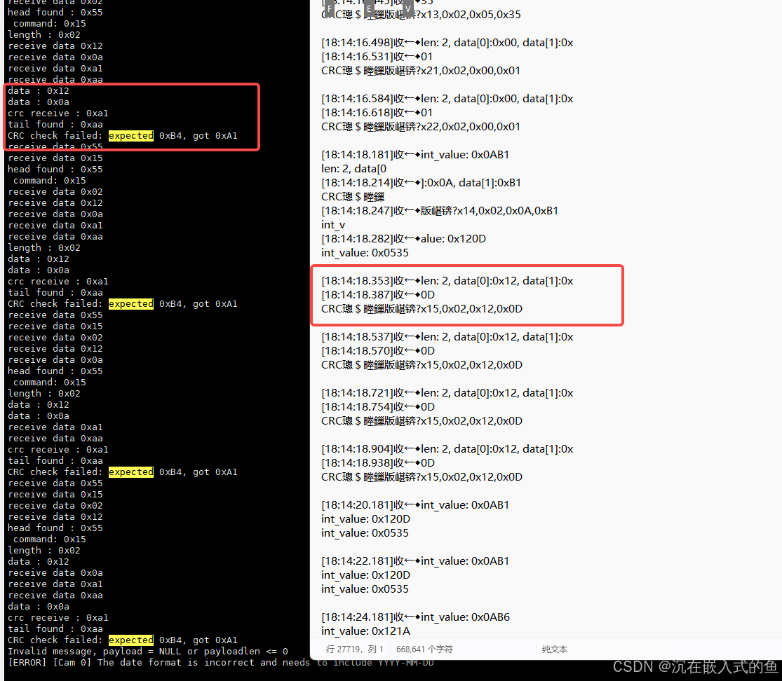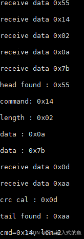如上图所示,在通信的过程中出现了CRC校验失败的问题,一开始以为是偶现的BUG,因为有时候运行1个小时才会出现,有时候运行5分钟就出现了,但是排查多几次发现每次CRC校验的那一帧数据都是一样的,CRC错误也是固定的那个值会校验失败,于是就在STM端打印发送的数据,发现发出的数据是55 15 02 12 0D A1 AA,其中A1是CRC校验值,但是linux端收到却是