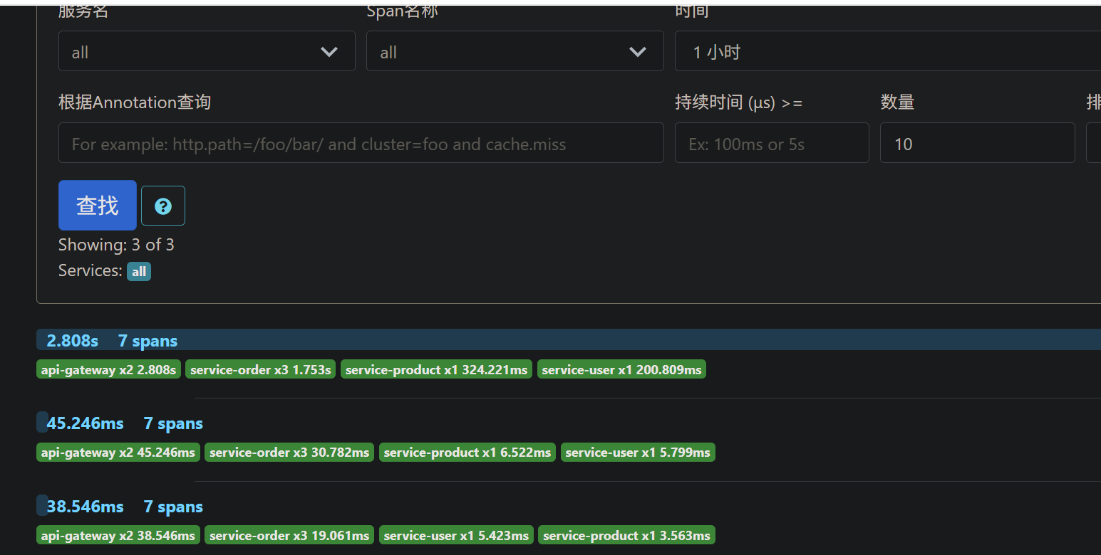 跨度(Span):表示请求在系统中的某个服务节点的一次调用过程,包括开始时间和结束时间。