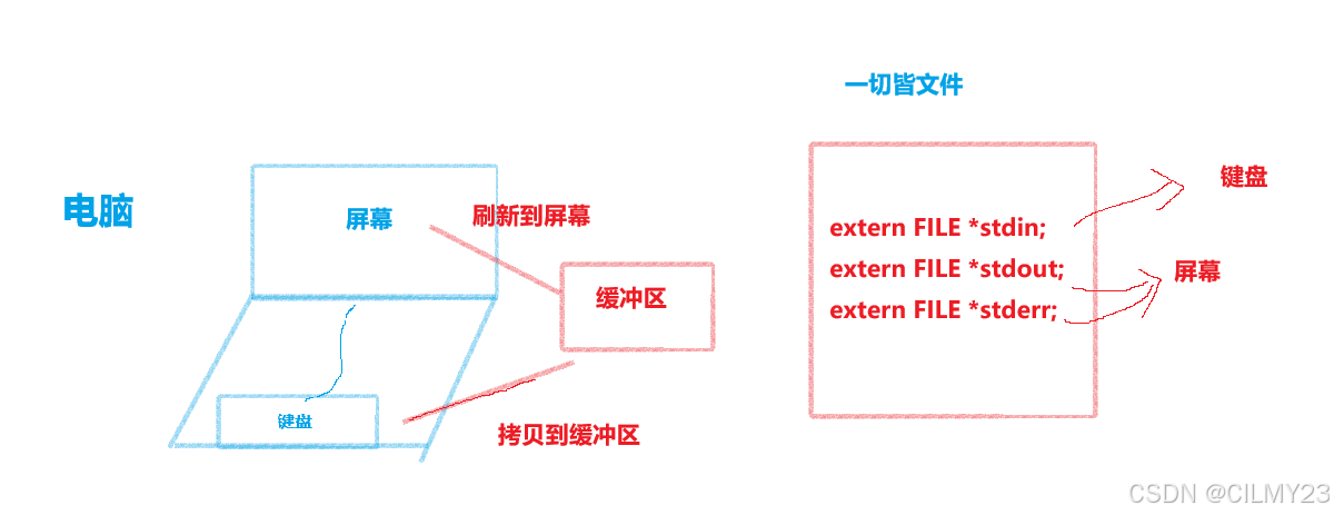 这里我画的比较抽象,不过不影响上述的理解惹,但是在Linux下一切皆文件,所以显示器(也就是屏幕)可以看作一个文件,我们C语言当中,程序在启动会默认执行三个输入输出流。