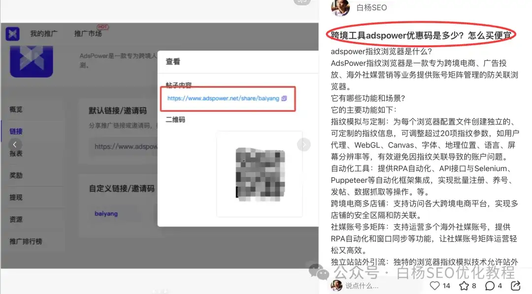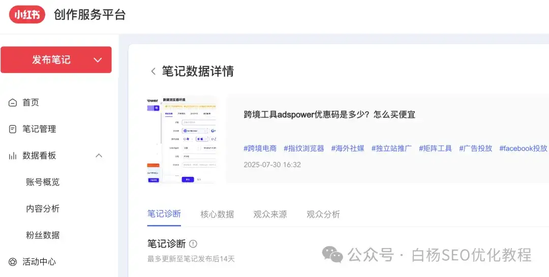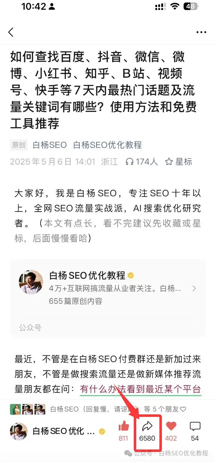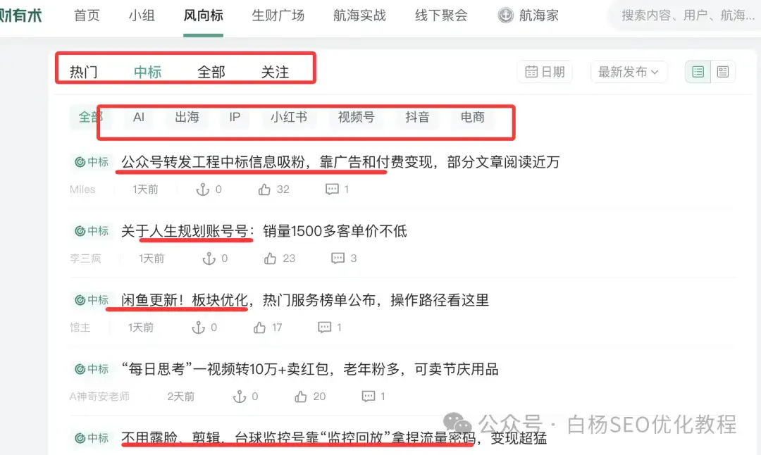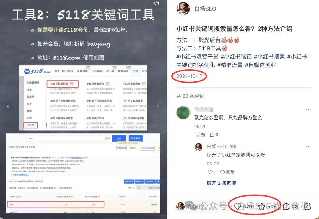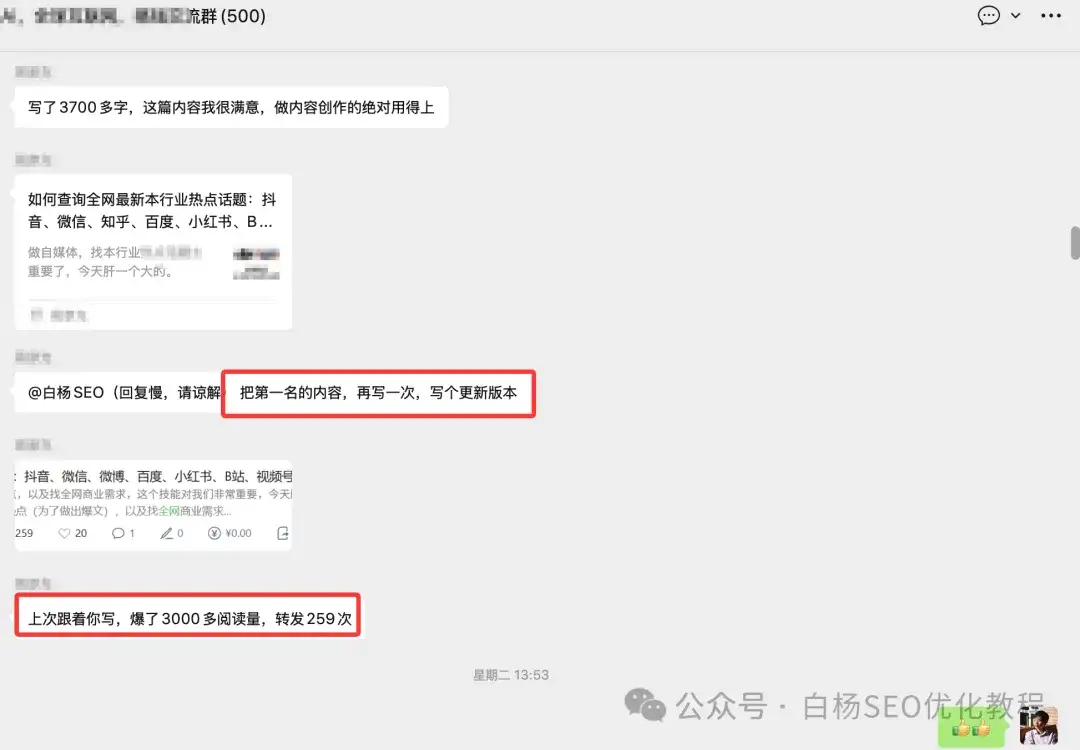 白杨SEO补:模仿做法,就是比如他在公众号,小红书,抖音推广形式,布局形式,它这个爆火内容换一种说法。