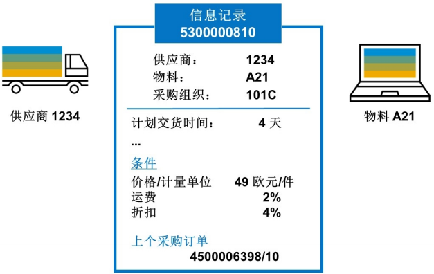采购信息记录是物料和供应商之间的桥梁,将物料和供应商相互连接起来(物料与供应商之间通过价格产生关联)