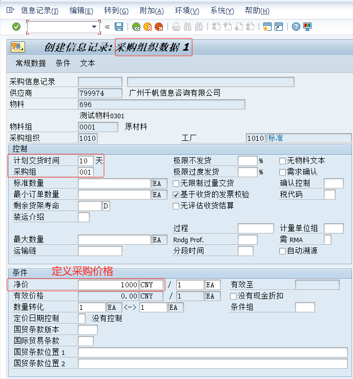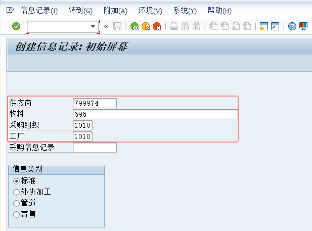 我们可以使用事务码ME11创建采购信息记录,这里我们选用供应商799974和物料主数据696进行采购信息记录的创建,维护在采购组织1010以及工厂1010下