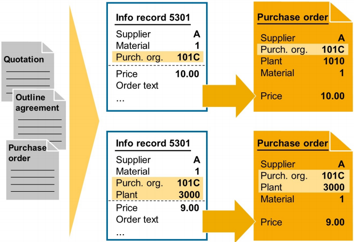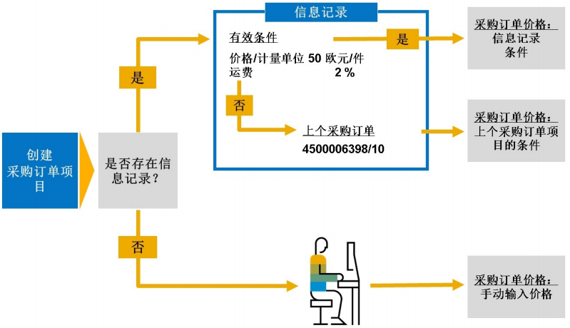 创建采购订单时,系统会在采购组织/工厂级别搜索供应商/物料组合的信息记录,如果采购组织/工厂组合没有特定的数据,则系统会在采购组织级别进行搜索,如果在此级别也未找到相关数据,则必须手动输入价格