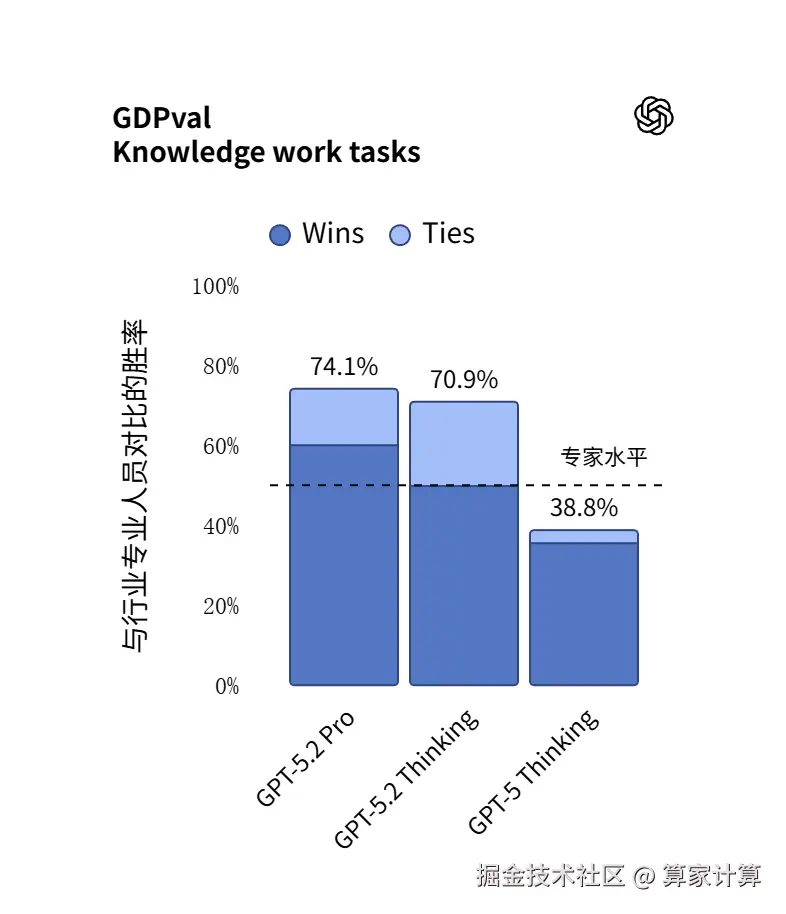 OpenAI掏出的全新GDPval基准测试(覆盖9大行业44类职业),让GPT-5.2的实力无可辩驳: 1、Pro版本在74.1%的真实工作任务中,击败或打平人类专家,投行建模、PPT制作等场景效率提升11倍,成本却不足人类1%; 2、256k超长上下文(约数十万字)处理准确率接近100%,几百份合同、财报"大海捞针"不再遗漏关键信息; 3、编程能力刷新纪录,SWE-bench Pro得分达55.6%,能独立完成多语言复杂工程、调试生产代码,被开发者称为"智能体编程的最大飞跃";数学推理实现"封神",AIME 2025测试拿下满分,ARC-AGI-1抽象推理突破 90%,金融预测、数据分析能力再上台阶。