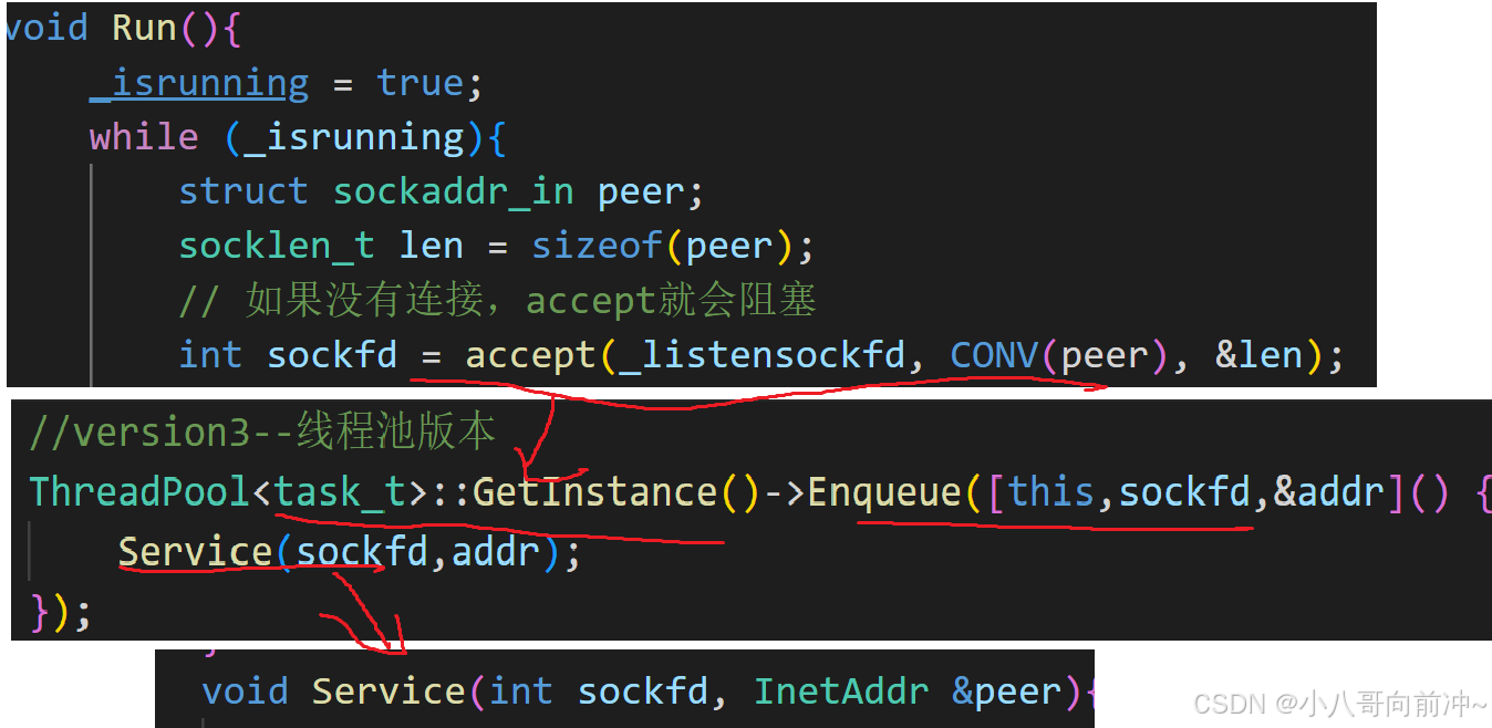主线程不断地阻塞接收accept,当接收成功,创建线程池,线程池中会创建固定多个子线程,然后将Service函数插入这些线程中,然后线程池底层唤醒子线程,转而这些线程就会处理这个Service服务。