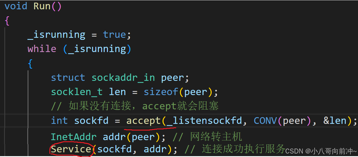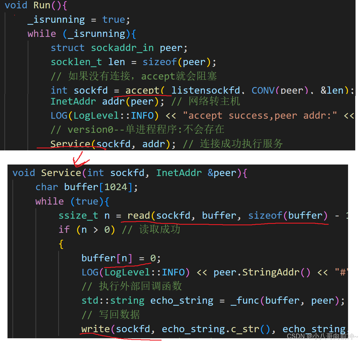 服务端跑起来,服务端进程就会不断地接收,当有一个客户端连接成功,服务端就会调用Service函数,然后死循环读,直到这个客户端不写了,退出了,服务端这个进程才会再次阻塞着接收,也就是说只要这个客户端一个不退出,那服务端就不会处理其他客户端信息。