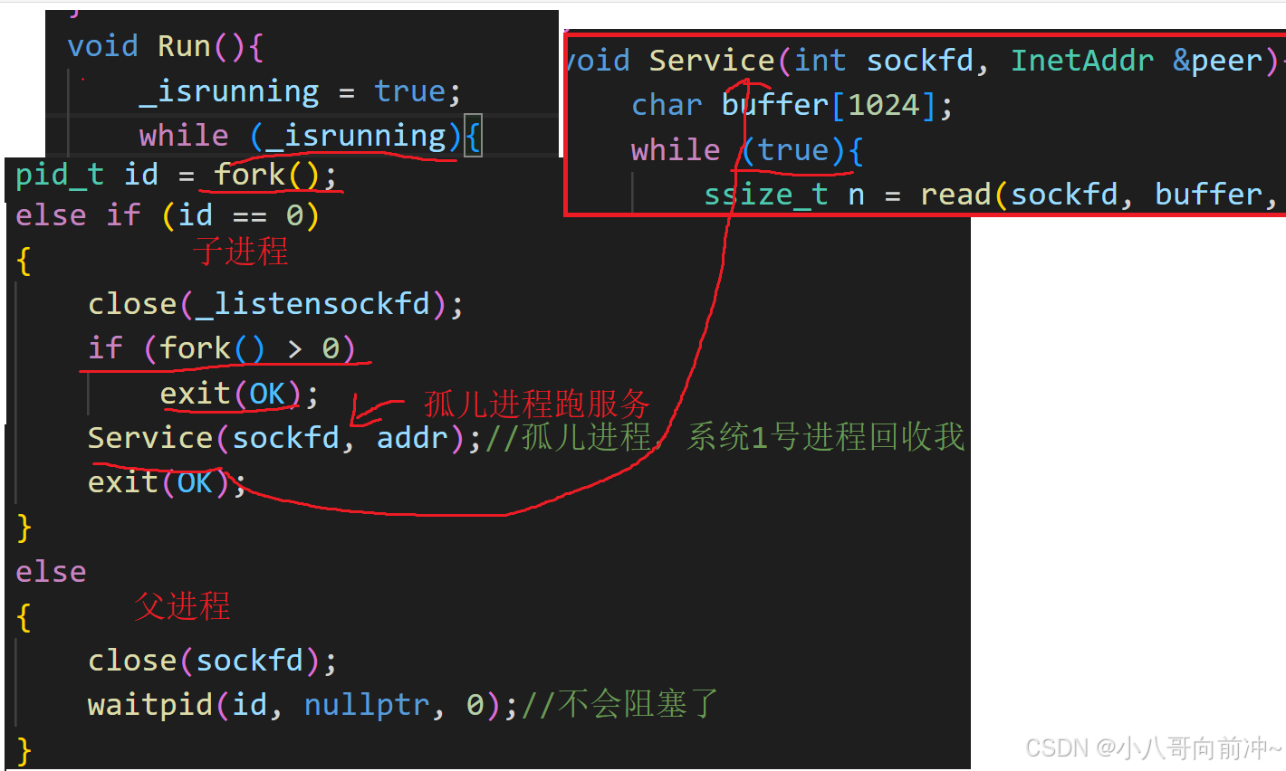 父进程阻塞接收accept,当接收成功,创建子进程,父进程阻塞等待回收子进程,子进程创建孙子进程,然后子进程直接退出,父进程等待回收子进程成功,父进程再次循环等待接收accept,而孙子进程就会变成孤儿进程,这个孙子进程会去调用Service函数(也就是说我们让孙子进程跑服务),跑完退出,系统1号进程会回收这个孤儿进程。