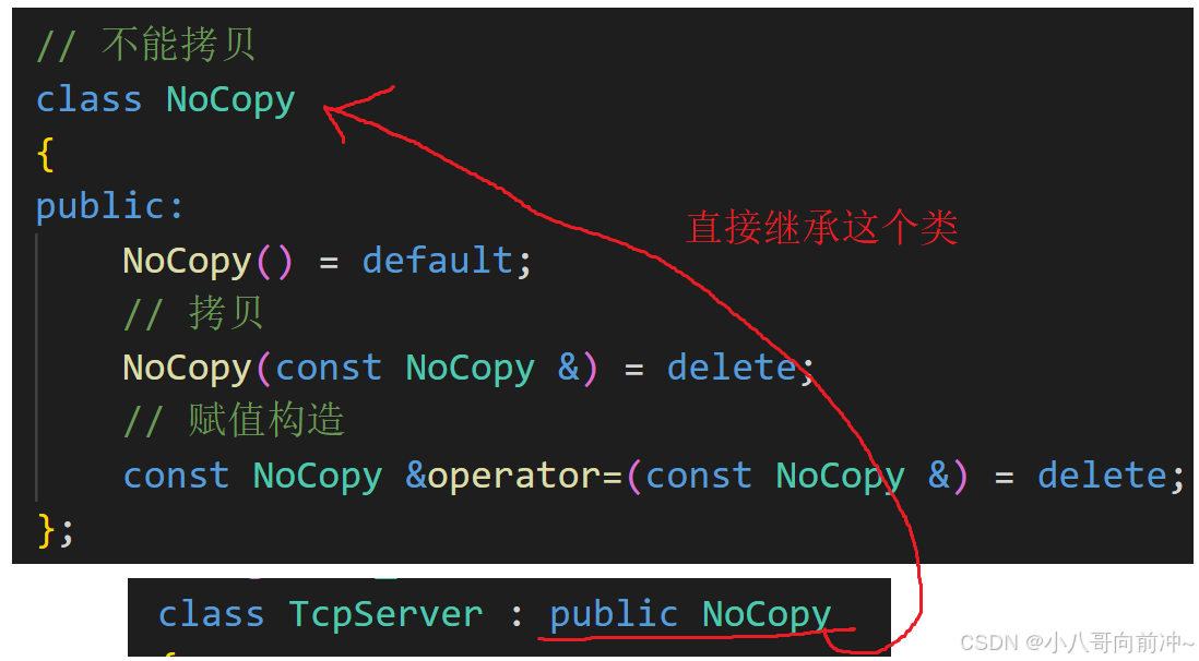 这样子类要拷贝的时候,也需要拷贝父类,而父类是不允许拷贝的,所以这个服务端类不能进行拷贝和赋值重载。