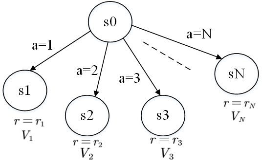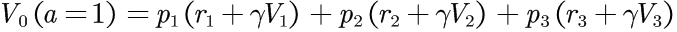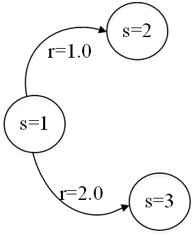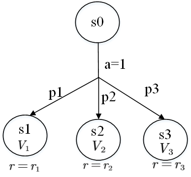 一个动作会以不同的概率导致三种不同的结果状态。以p1到达状态s1,以p2到达状态s2,以p3到达状态s3(p1+p2+p3=1),每个目标状态的奖励为r1、r2、r3,计算执行动作1后的期望价值,需要将各个状态的价值乘以概率后相加: