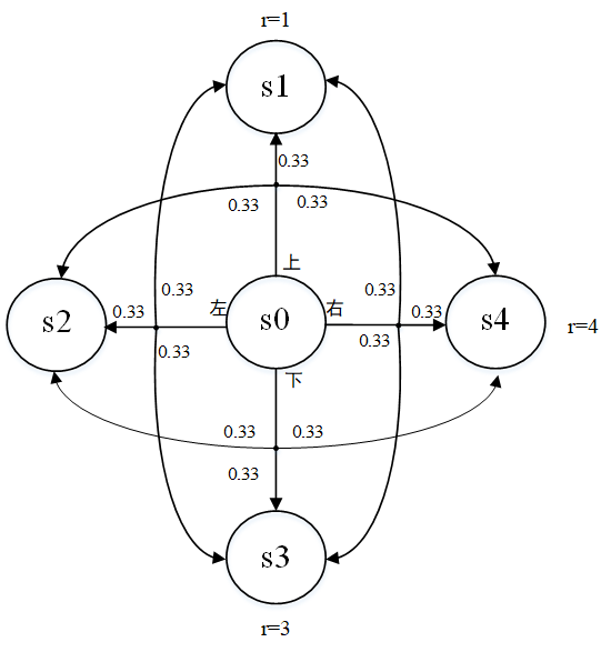 每个动作的概率都与FrozenLake(某游戏)中方式相同:33%的概率会按动作执行,33%的概率会滑动到方向的左侧目标单元格,33%的概率会滑动到方向的右侧目标单元格,为简单起见假设=1.