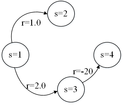(3)智能体从初始状态执行动作"向下"后,达到最终状态,获得奖励2.