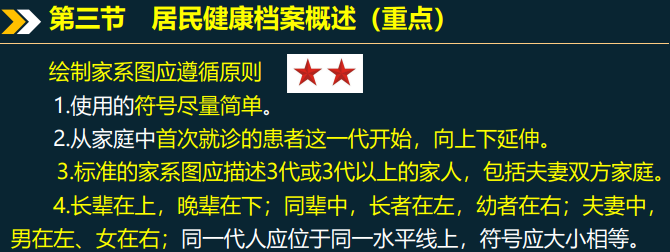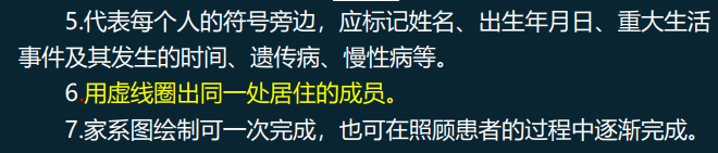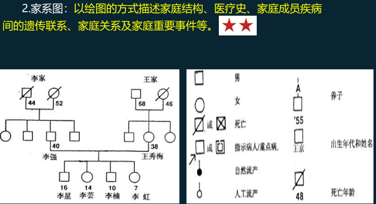 家系֣图:以绘图的方式 描述家庭结构、医疗史、家庭成员疾病间的遗传联系、家庭关系及家庭重要事件等。