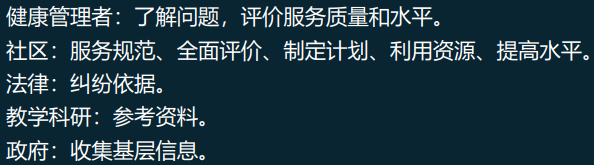 1.能够帮助健康管理者全面、系统地了解居民的 健康问题及 患病的相关背景信息。