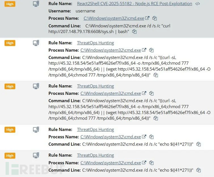 Huntress记录的首例Windows终端攻击尝试可追溯至2025年12月4日,当时未知攻击者利用Next.js漏洞实例投放shell脚本,随后执行命令部署加密货币挖矿程序和Linux后门。在其他案例中,攻击者还执行了探测命令,并试图从C2服务器下载多个有效载荷。部分入侵活动专门针对Linux主机投放XMRig加密货币挖矿程序,甚至利用公开的GitHub工具识别易受攻击的Next.js实例。