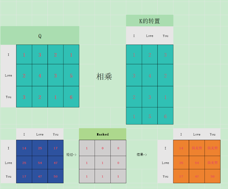其中,dk是 Key 向量的维度。通过 softmax 操作,得到的矩阵表示了每个词语对于其他词语的注意力权重。