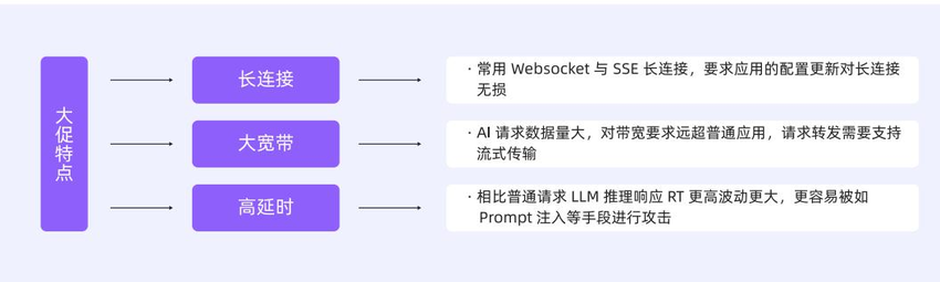长连接 **:**由 AI 场景常见的 Websocket 和 SSE 协议决定(用于服务端实时推送数据到客户端浏览器),长连接的比例很高,要求网关在更新配置操作时、对长连接无影响,不影响业务。