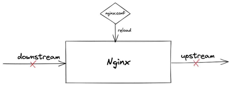 而类似于 Nginx 这样的 Web 2.0 时代所诞生的流量 网关 ,并不能解决该问题,因为 Nginx 的整体配置文件发生任意变更,都需要重启 Worker 进程,这会同时导致客户端连接(Downstream)和服务端连接(Upstream)断开:
