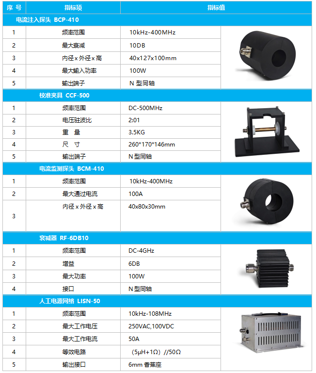 | BCI-2004 | BCI大电流注入测试系统,内置信号合成器,三通道功率计、RF功放双定向耦合器,频率范围:100kHz-400MHz;输出功率,200W 50DB | 4U/19"标准机箱 220VAC10A |