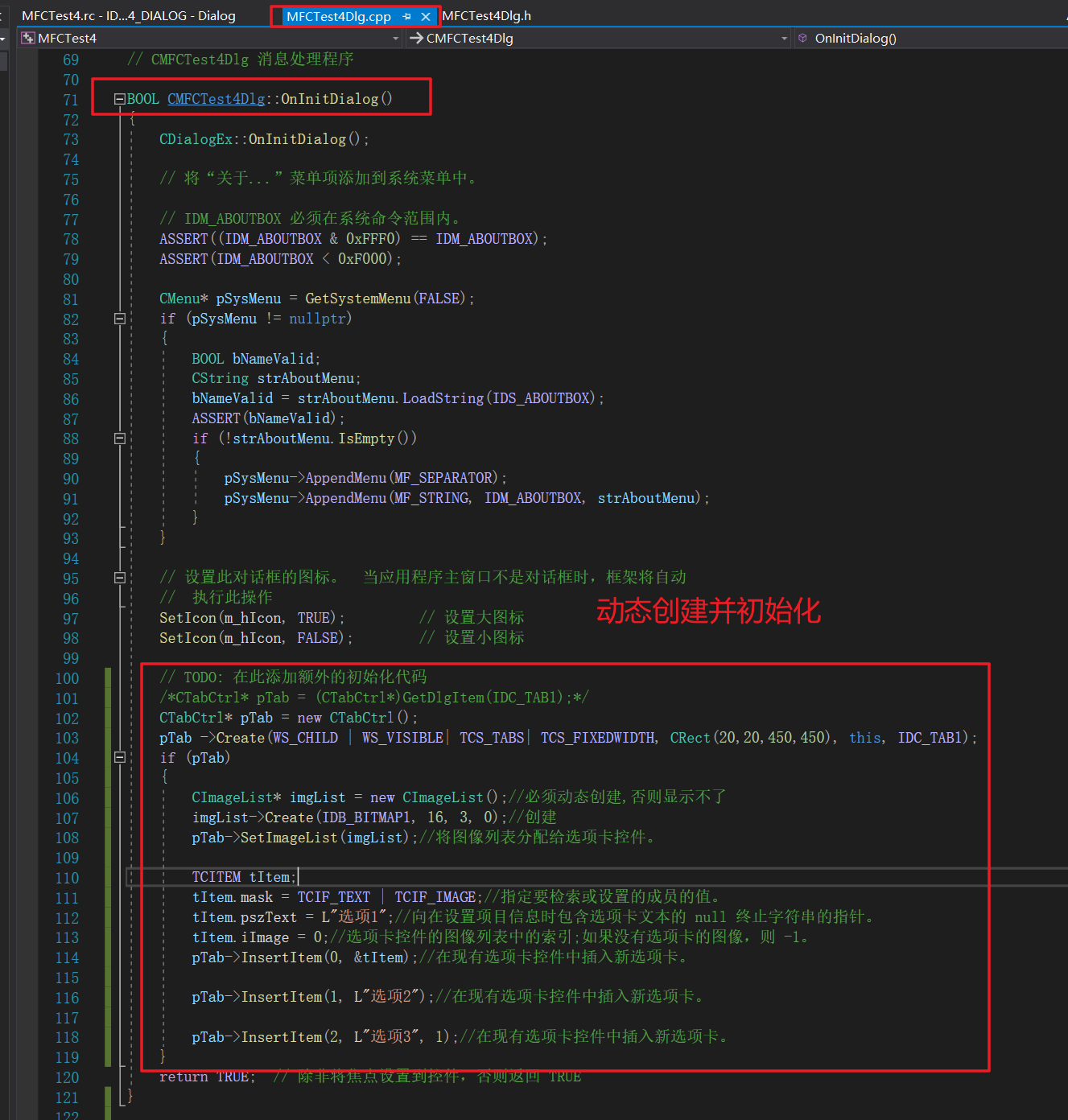 pTab->InsertItem(2, L"选项3", 1);//在现有选项卡控件中插入新选项卡。