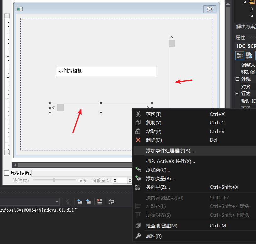 pSrlb_v->Create(WS_CHILD | WS_VISIBLE | SBS_VERT | SBS_TOPALIGN | WS_CHILD, CRect(550, 50, 580, 350), this, IDC_SCROLLBAR2);