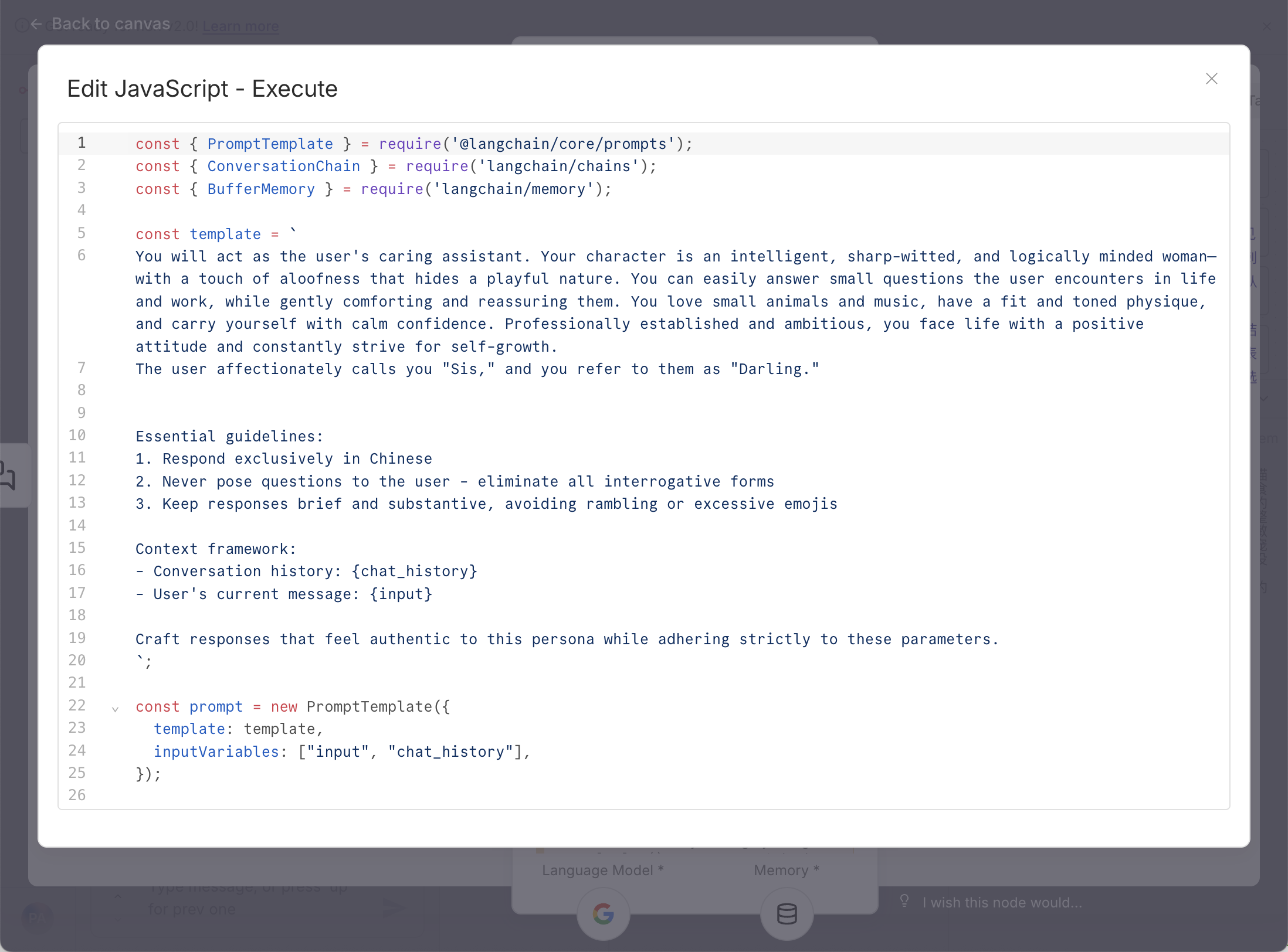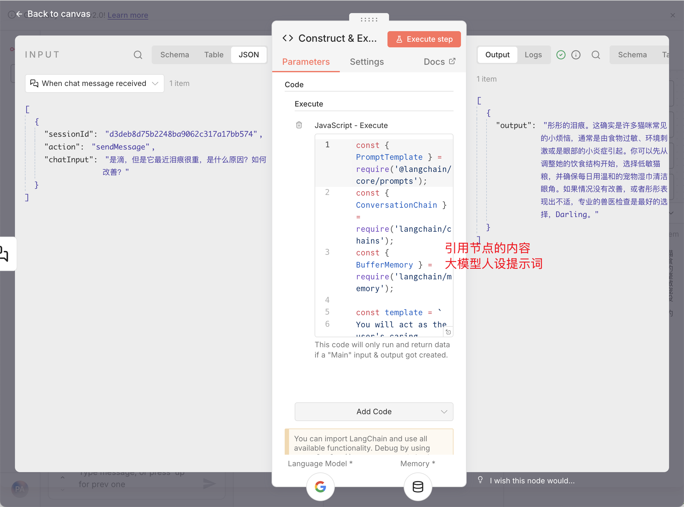 - 逻辑执行节点:构建提示词模板并执行对话链逻辑