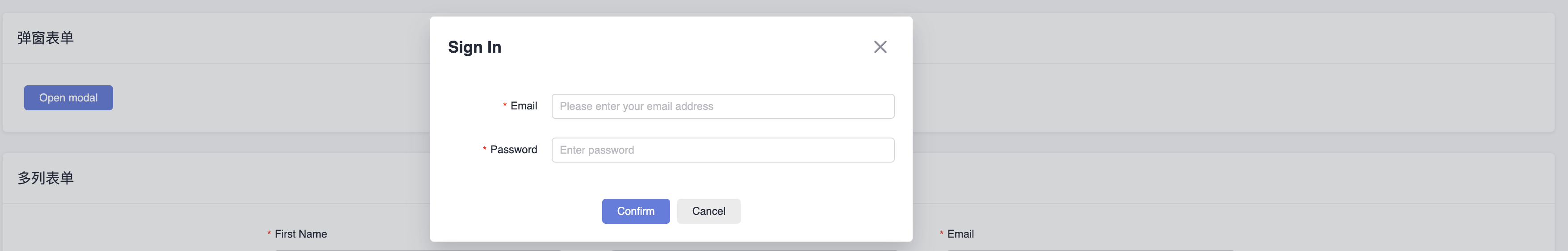 表单布局页展示了多种布局形式的表单,包含横向、垂直、弹框、多列等形式。