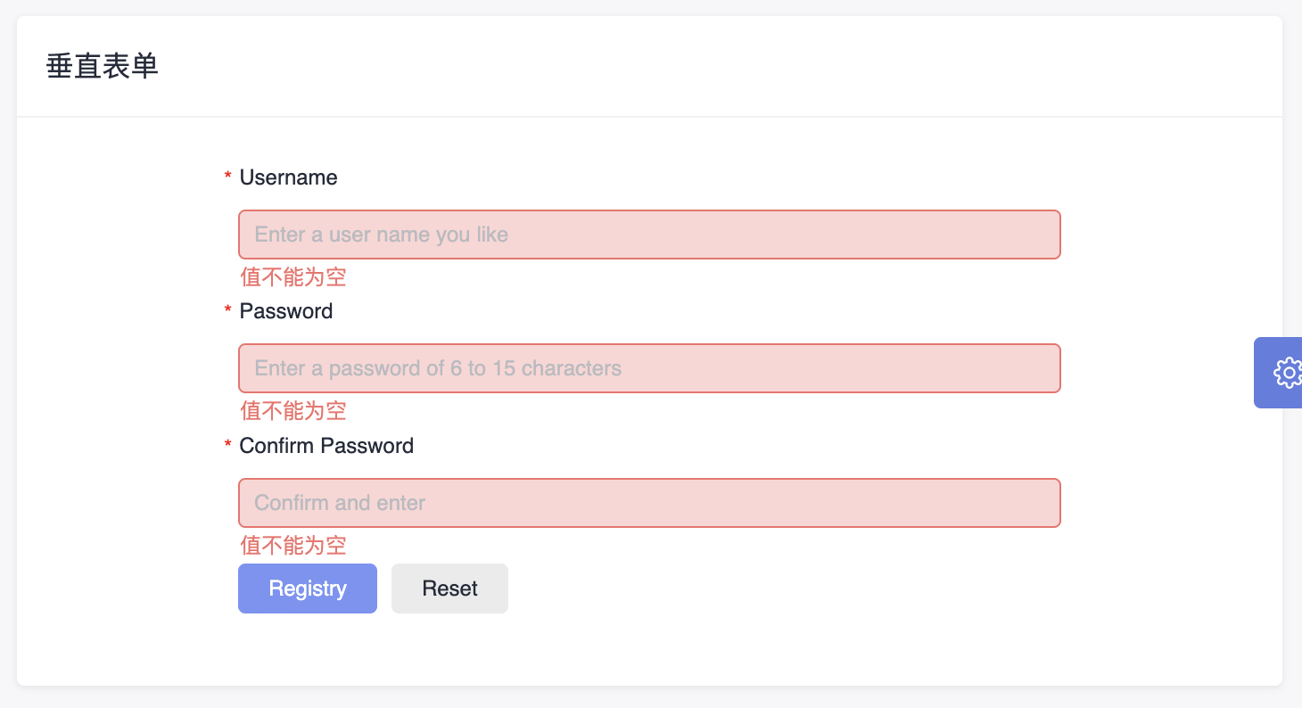 - 当表单验证失败时显示统一提示信息:"The form verification failed, please check.",并以文本形式展示。