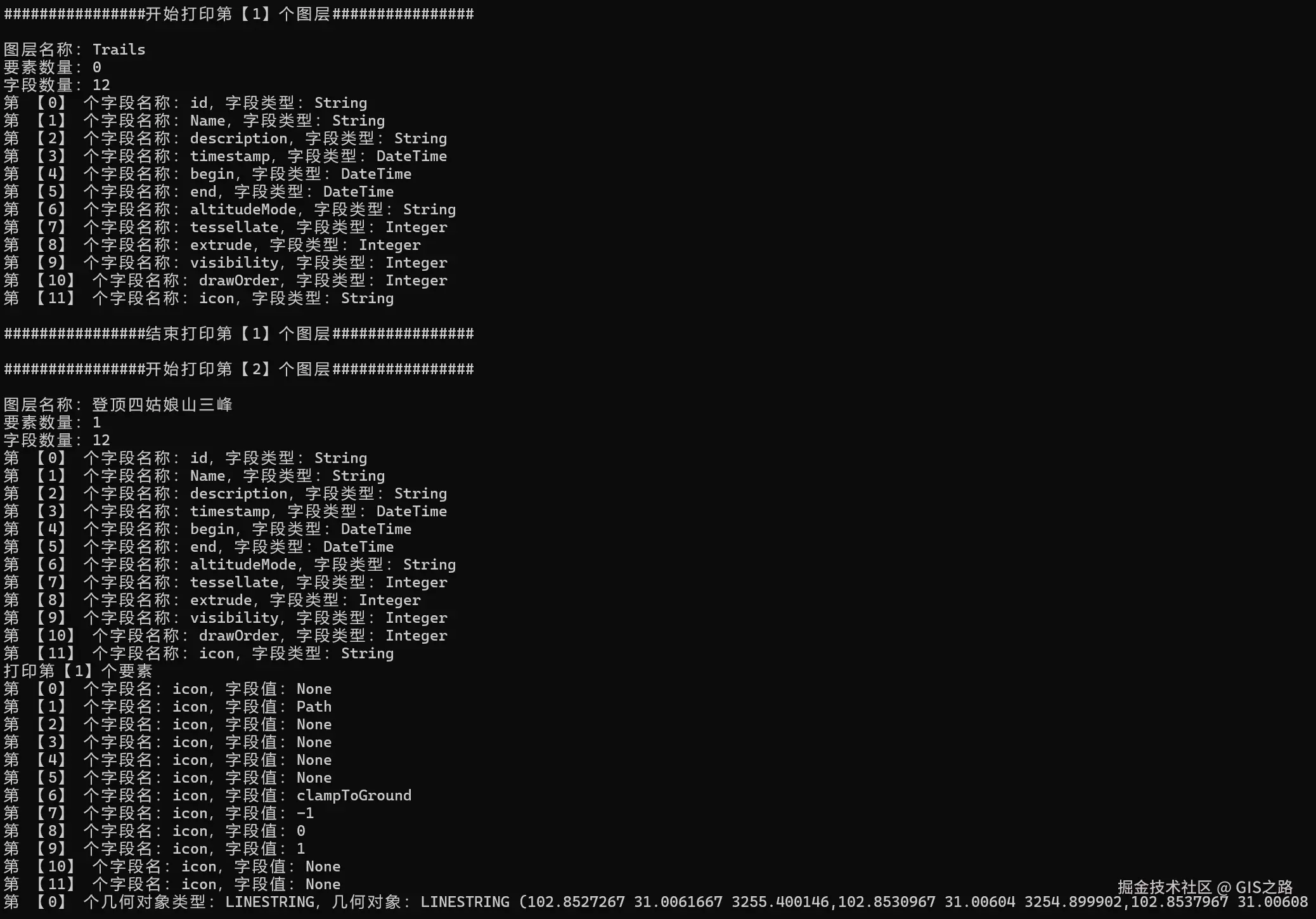 之后通过遍历图层获取图层字段数量、字段名称以及字段类型等信息,在输出结果中读取要素属性信息和几何对象并限制要素输出数量。