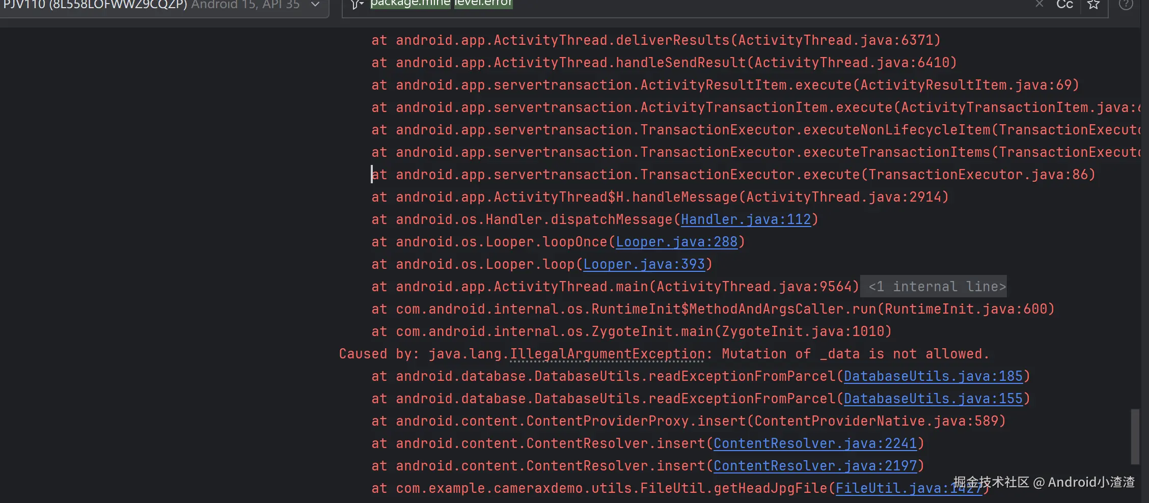 该错误的核心原因是尝试修改 Android 系统中受保护的 _data 字段 。_data 是媒体库(MediaStore)中存储文件路径的字段,Android 从 API 29(Android 10)开始限制直接修改该字段,强制要求使用 MediaStore 的规范 API 进行文件操作,禁止通过 ContentResolver 直接插入或修改 _data 字段,否则会抛出 IllegalArgumentException: Mutation of _data is not allowed 异常。