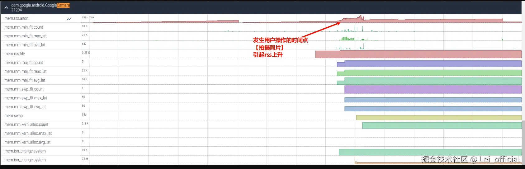 从这个图可以看出,在大约时间进行到2/3时,mem.rss.ion 发生增长,说明此时用户操作引起了内存分配。
