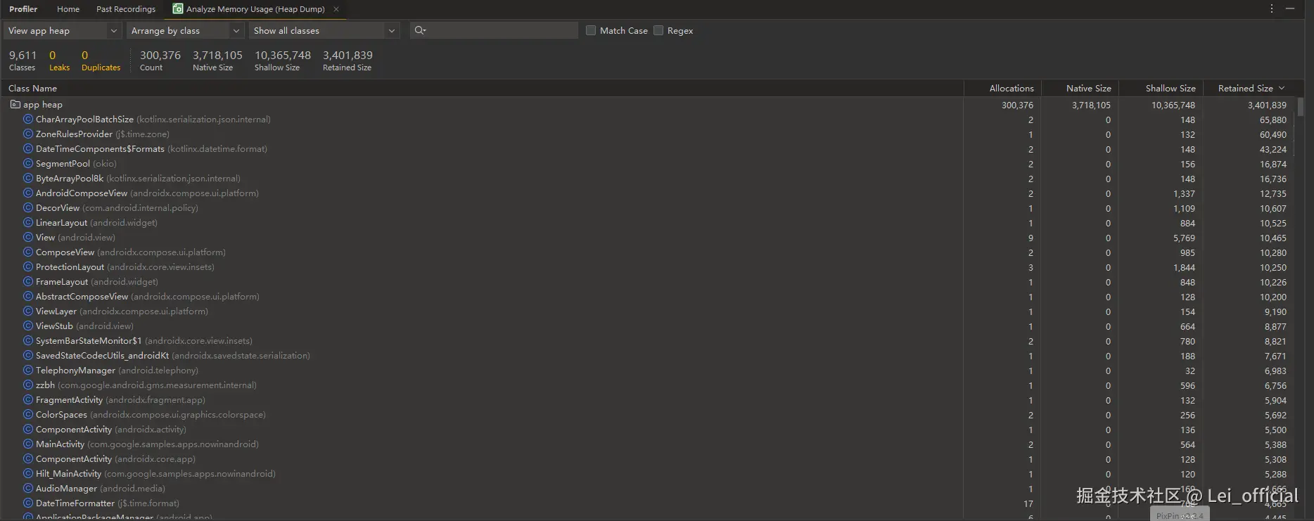 抓取对应包名的 prof 文件后,将其 pull 到电脑上,改名为 *.hprof后,就可以在 AndroidStudio 中查看当前进程的 JVM 内存快照。