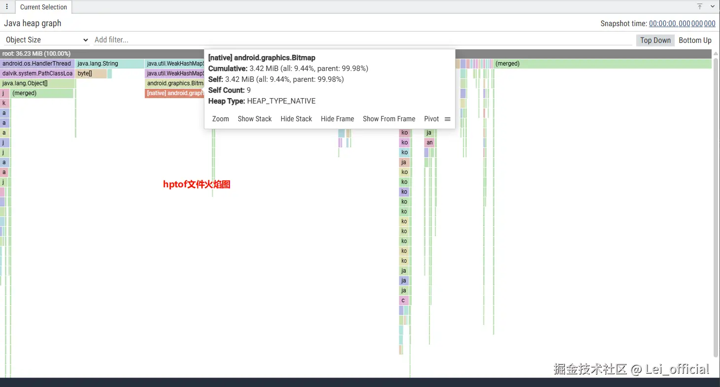 也可以用 Perfetto 在线打开该快照,会以火焰图的方式展示对象占用堆大小,对于类型相同的对象聚合后展示,优点是更加直观,缺点是无法查看对象内部数据。