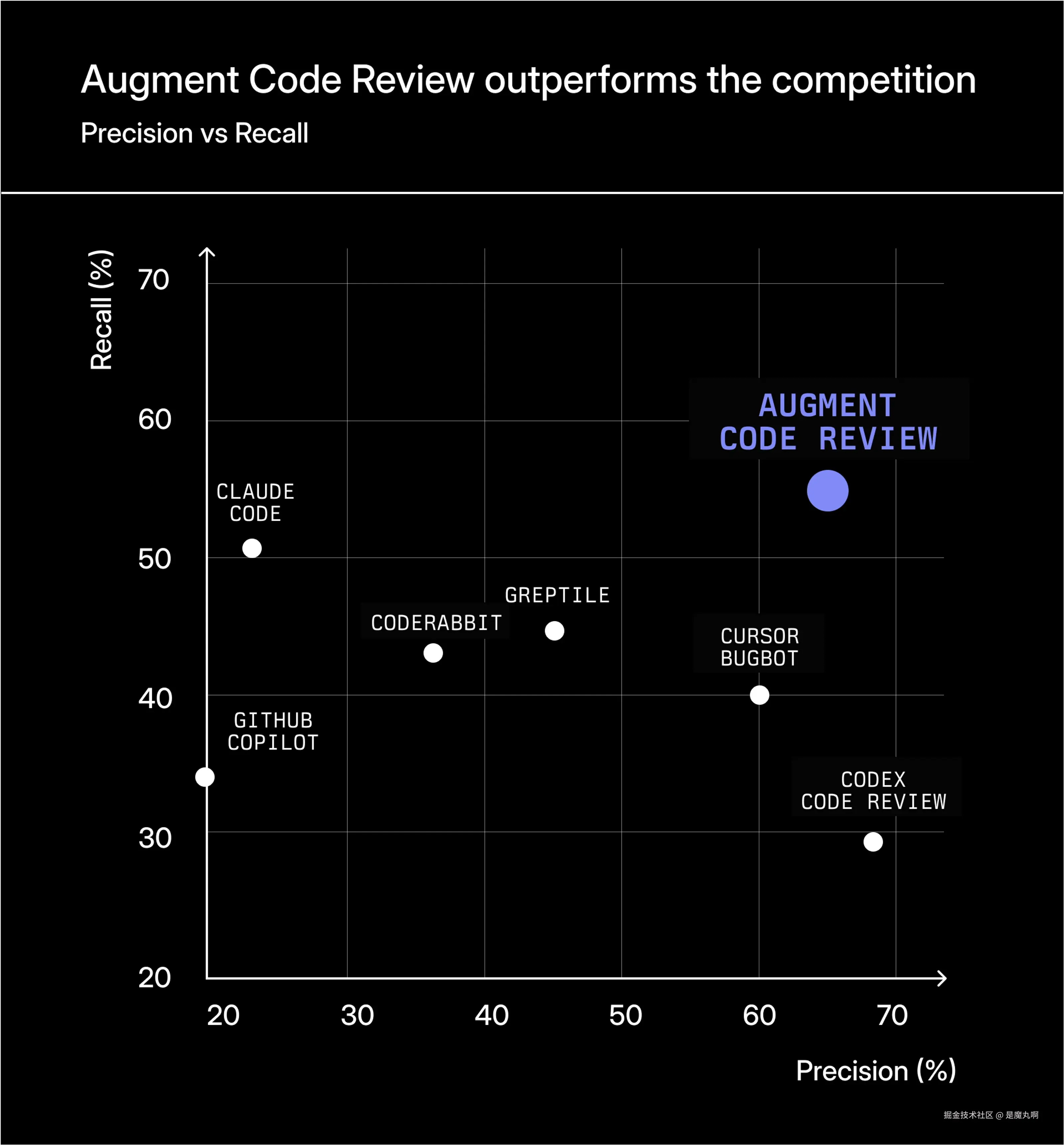 Augment Code Review在唯一的AI辅助代码审查公共基准测试中取得了最高的准确度,在整体质量上比Cursor Bugbot、CodeRabbit等其他系统高出约10个百分点。一个关键原因是什么?我们选择GPT-5.2作为代码审查的基础模型------以及我们的模型无关方法让我们能够为软件开发生命周期的每个阶段选择最佳工具。Augment Code Review最初基于GPT-5构建,但随着我们观察到OpenAI最新推理模型的质量提升,我们升级到了5.2版本。