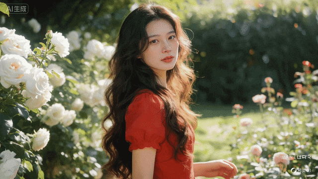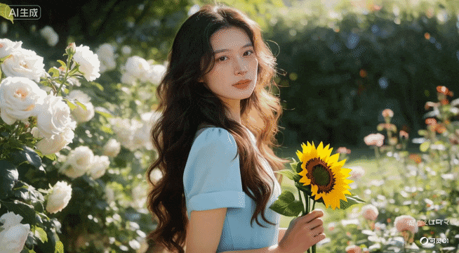 在光锥智能测试中,我们先是把一张AI图片投喂给可灵生成视频,再要求它基于该视频,把任务的裙子从红色改成水蓝色,再给女生的手里加一朵向日葵。可灵o1完整执行了这两项指令,虽然在裙子袖口的细节上做的还不够还原,但整体达到了要求。